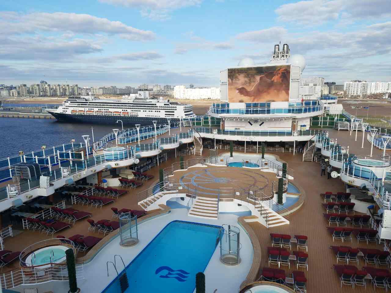 Fountain Pool/ Plunge Pool These two fresh water pools flank an island area between them. During the day guests can relax and rejuvenate poolside in a variety of seating options, including circular loungers, garden-style furniture, bar-height tables and stools, and chaise lounges. At night, the pool area transforms with Princess WaterColor Fantasy®. Architectural lighting effects set the mood and the island area becomes a stage showcasing an interactive sound and light show featuring dancing fountains. With a sophisticated lighting and sound system, and a computerized fountain featuring 85 water jets, guests can marvel as streams of water shoot 33 feet into the night sky.