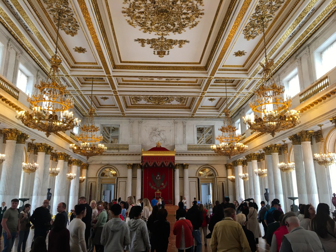 “The Peter the Great (Small Throne) Room was created in 1833 by Auguste Montferrand and restored after the 1837 fire by Vasily Stasov. The room is dedicated to the memory of Peter the Great – its decoration features the Emperor’s monogram (two Latin letters P), double-headed eagles and crowns. In a niche that is designed like a triumphal arch is a painting of Peter I with Minerva. Set into the upper parts of the walls are paintings (by Pietro Scotti and Barnaba Medici) depicting Peter in major battles of the Northern War. The throne was made in St Petersburg in the late 18th century. The room is embellished with panels of Lyons velvet embroidered with silver thread and silver articles by St Petersburg craftsmen.” – Hermitage Official Website