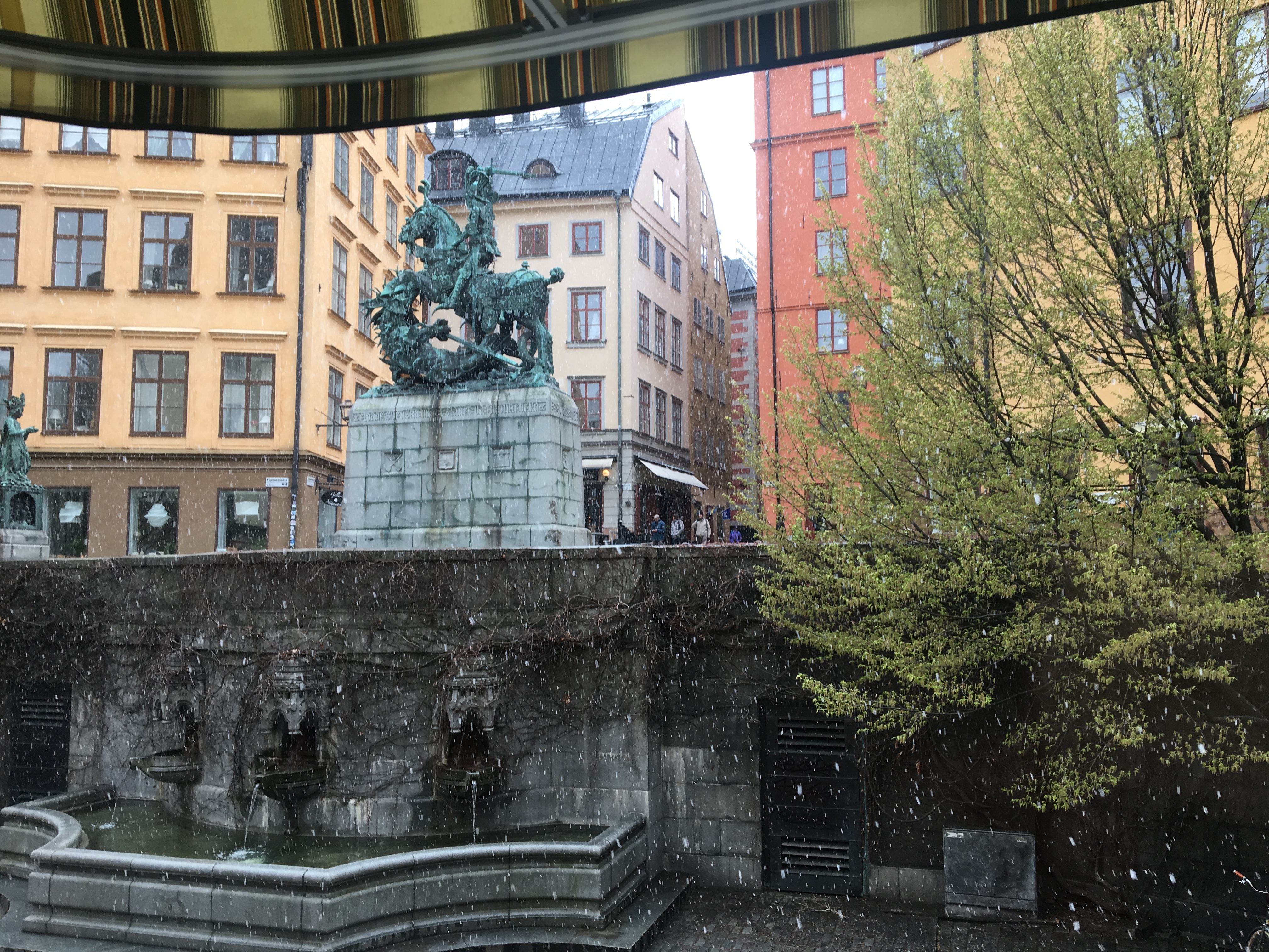 IMG_9528 July 7, 2017 4032 × 3024 Across a lovely fountain underneath a statue of St. George and the Dragon.